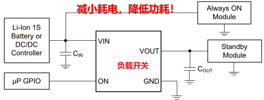 5、减小漏电流,有的负载关断后仍然有可观的漏电流,这时可用负载开关切断电源供电,漏电流自然减小。