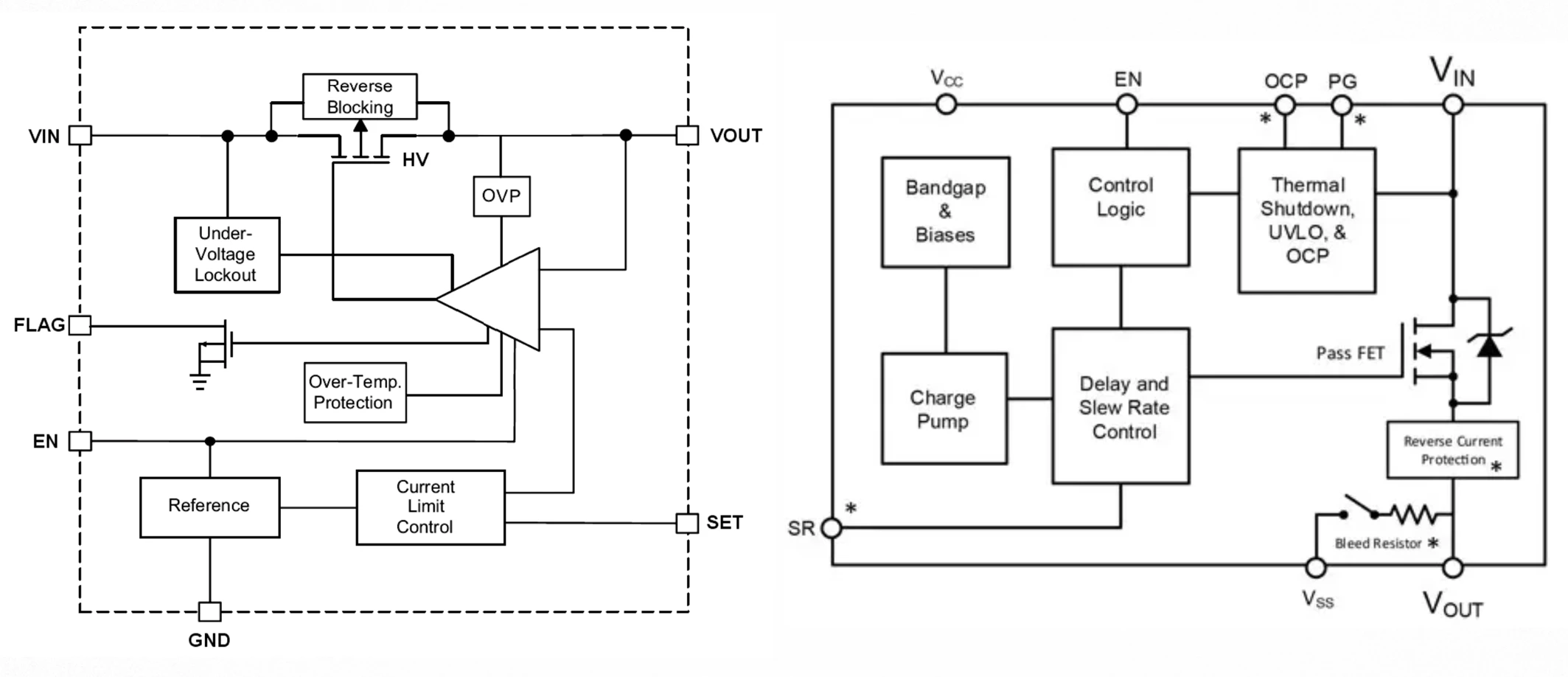 下图列举了两款负载开关芯片的内部框图,可见通常会集成如下的东东: