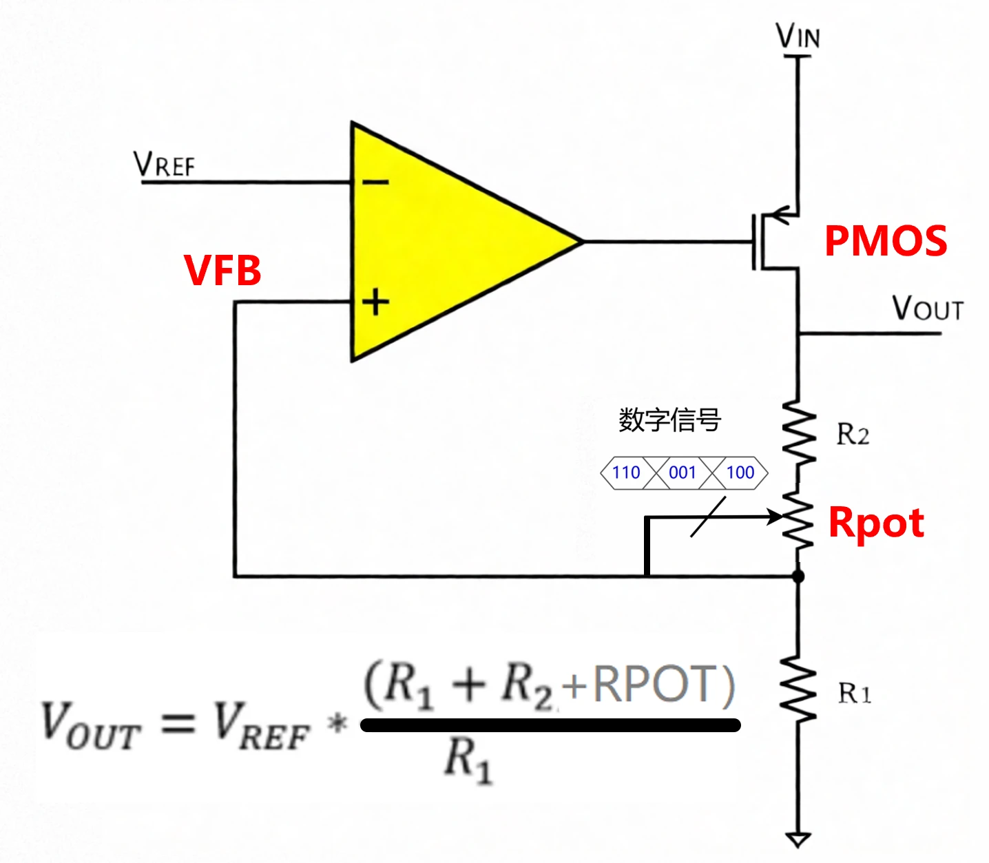 如下图,通过数字信号控制数字电位器Rpot的阻值,从而改变分压值,即可实现输出电压可调。
