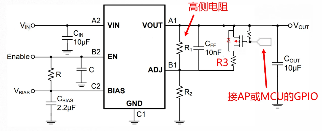 - GPIO拉高则NMOS导通,则R3对地存在通路,ADJ脚的下分压电阻变为R2//R3,从而调整输出电压。