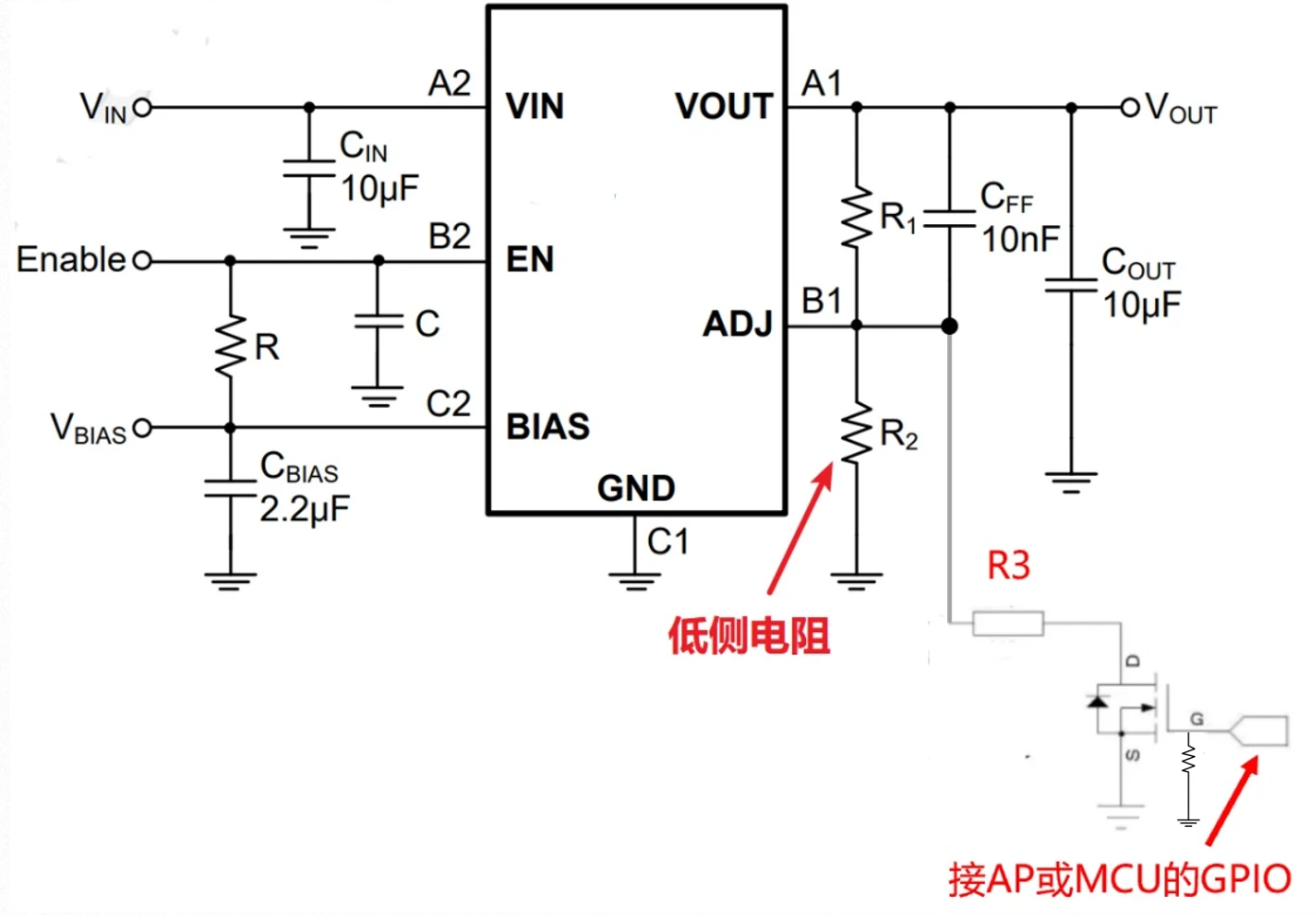 - GPIO为低则NMOS关断,ADJ脚的下分压电阻为R2;