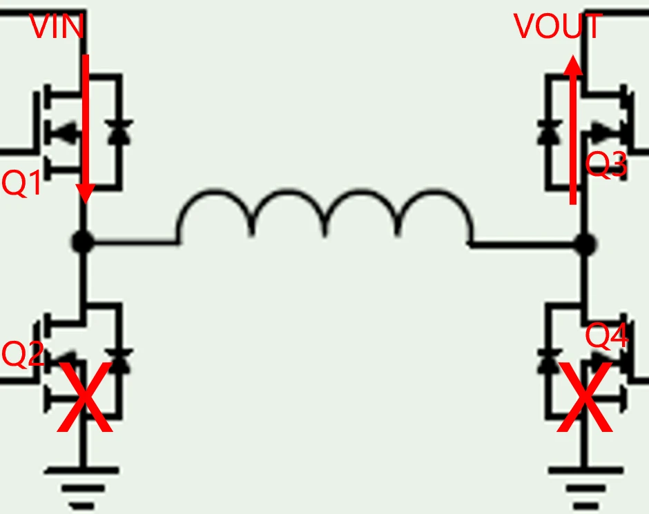有的芯片公司采用直通的策略,即Q1和Q3常通,Q2和Q4常断,此时电感L被连接到输入和输出之间。如果忽略开关管和电感的导通压降,则Vout≈Vin。
