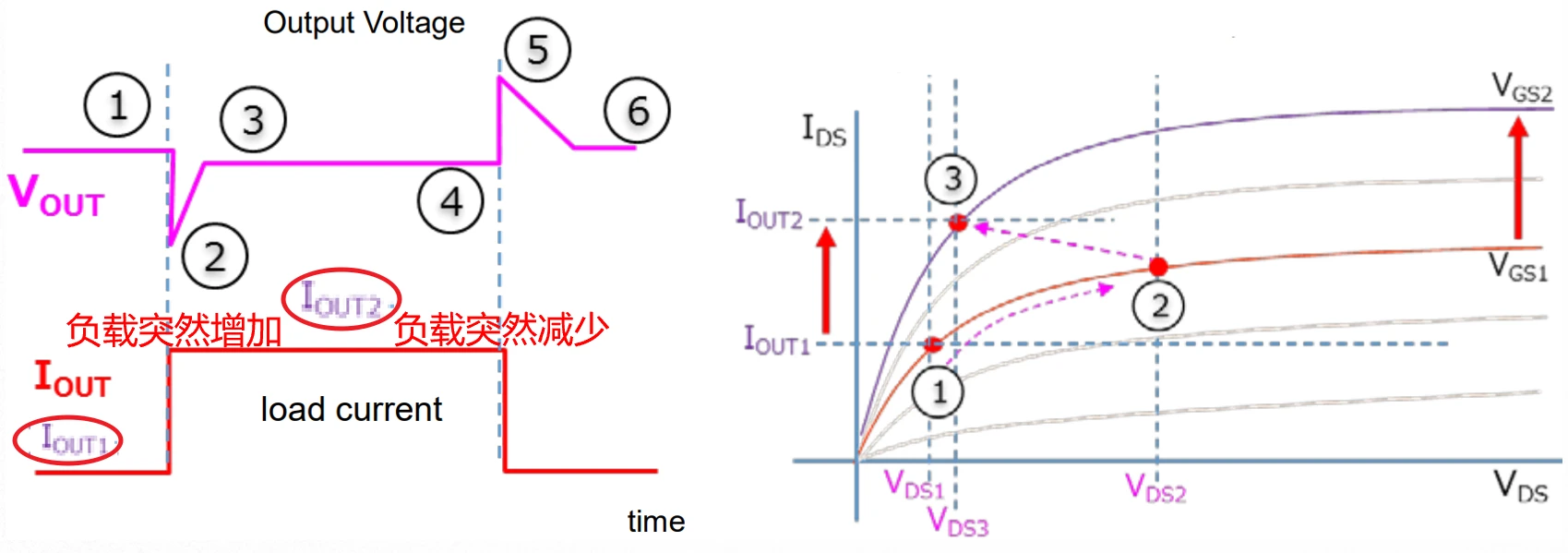 初始时刻,LDO的负载电流稳定在IOUT1,输出电压VOUT1也调得稳稳的,此时MOS漏源电压和栅源电压分别为VDS1和VGS1,一切岁月静好。