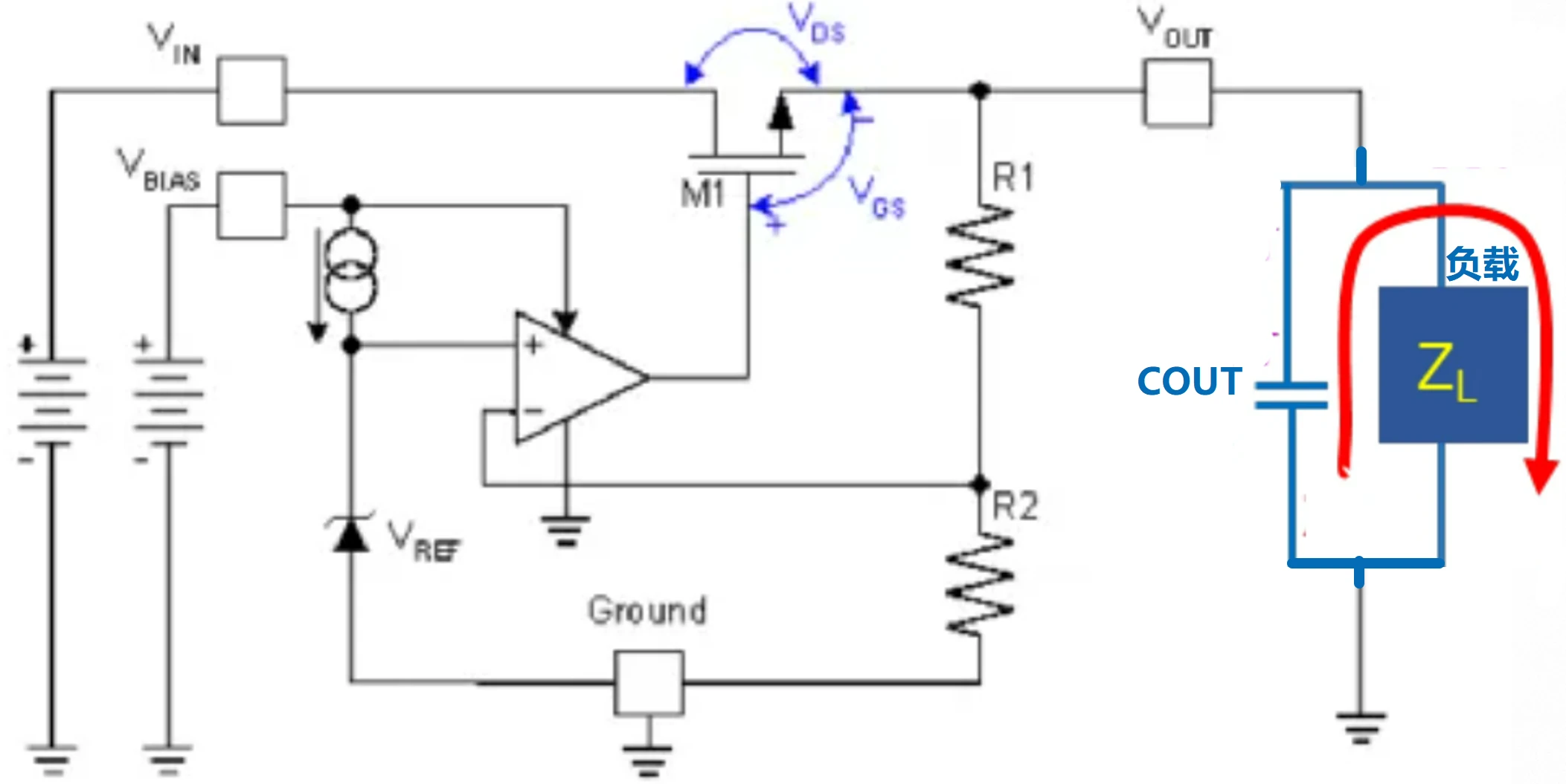 但当负载电流突然从IOUT1跳到IOUT2时,从电路上看就是:因为负反馈环路有延迟,所以栅源电压VGS1是暂时不变的,变大的负载电流IOUT2会在MOS产生更大的压降,于是MOS的漏源电压从VDS1增大到了VDS2。