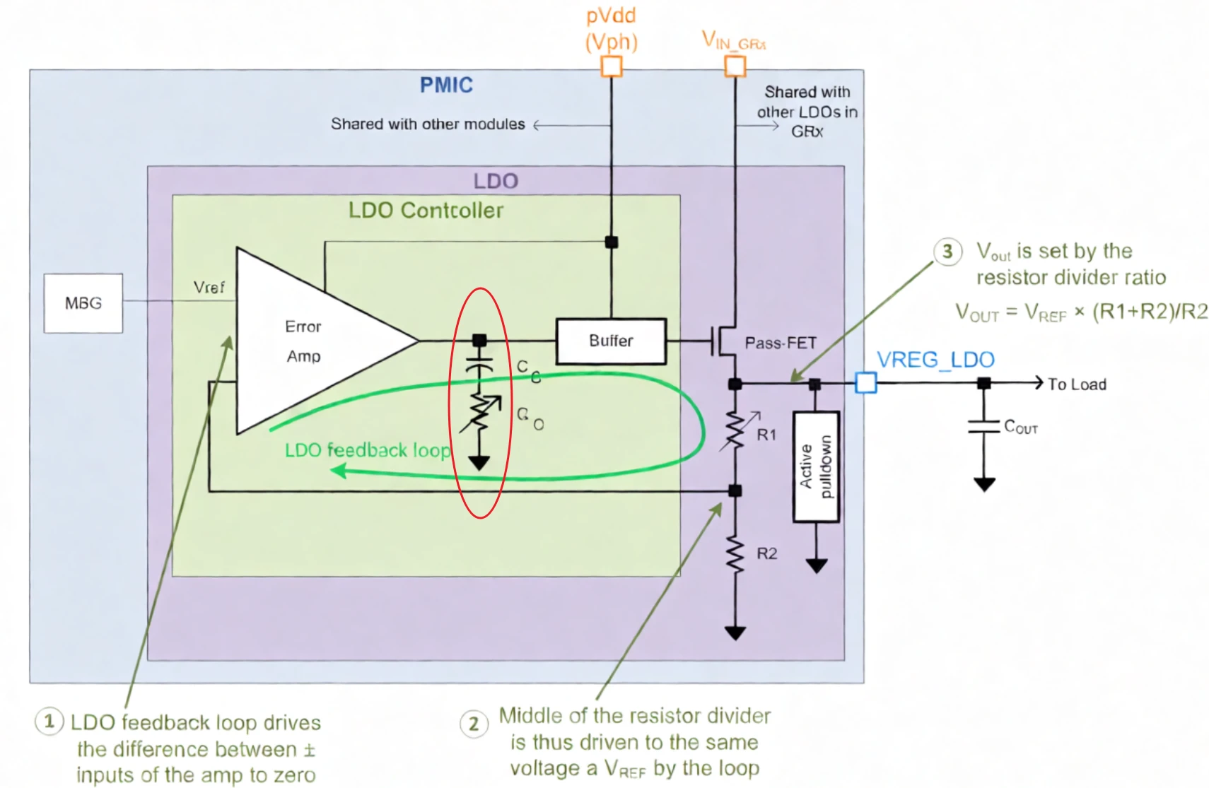 近年来,LDO的一个重要发展方向就是通过内部补偿的方法来减少外部器件的影响。以高通平台的LDO为例,如下图,在LDO内部集成了补偿,遂产生一个零点(零点的作用与极点相反,它能提升速度,补偿相位滞后),从而使输出极点不再是稳定性的关键,于是对输出电容便没有特殊要求(甚至ESR越低越好)。