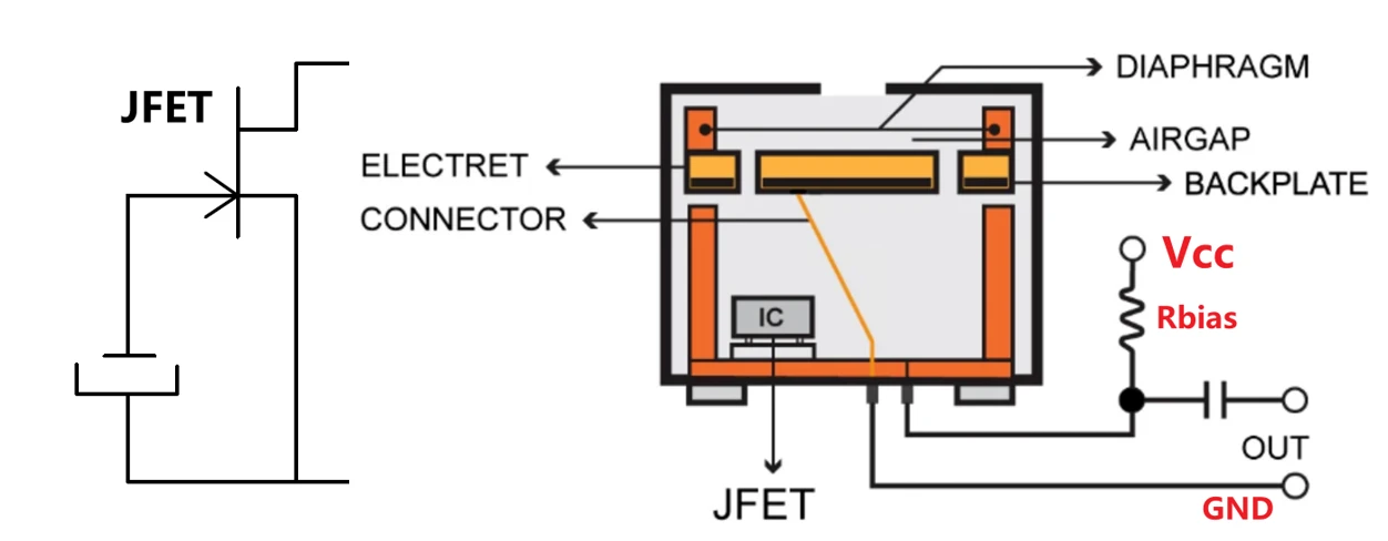 这样一来,声音的机械振动就转换成了电压的变化,这个微弱的电压信号就是麦克风最原始的输出。但这个电容器的输出阻抗极高(约GΩ级),电压非常微弱,极易被干扰,无法直接使用。因此麦克风内部通常集成一个JFET用作阻抗转换/放大器。