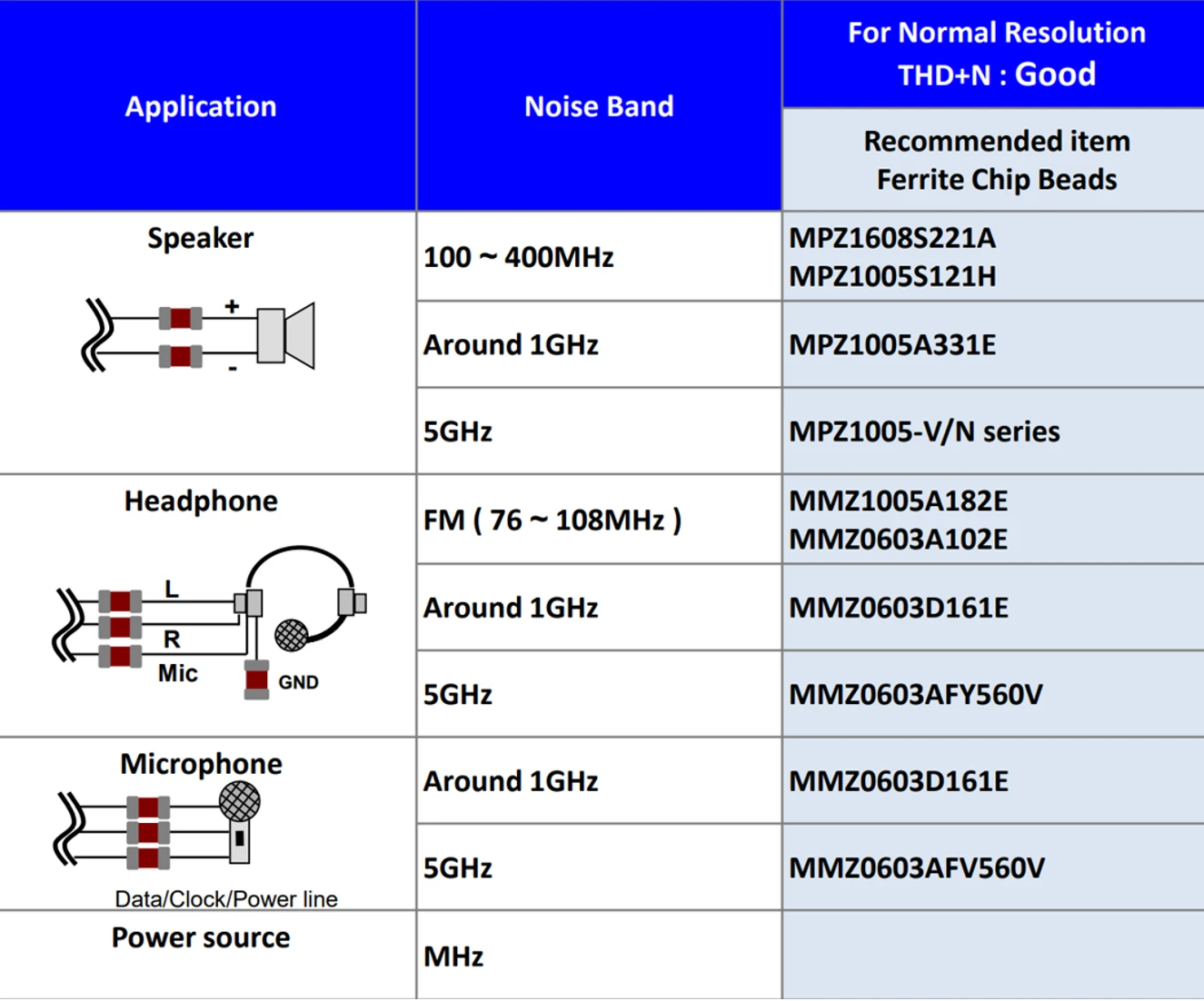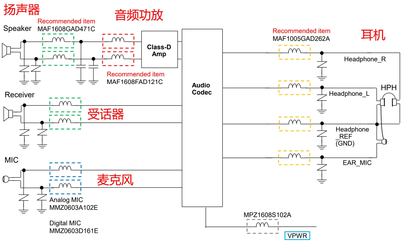 在手机音频电路上,为了防止干扰别人以及别人干扰自己,一般使用铁氧体磁珠作为和事佬进行静噪,磁珠在这里的核心作用就是隔离与滤波。下面是TDK公司所归纳的,手机音频场景中所用到的磁珠。