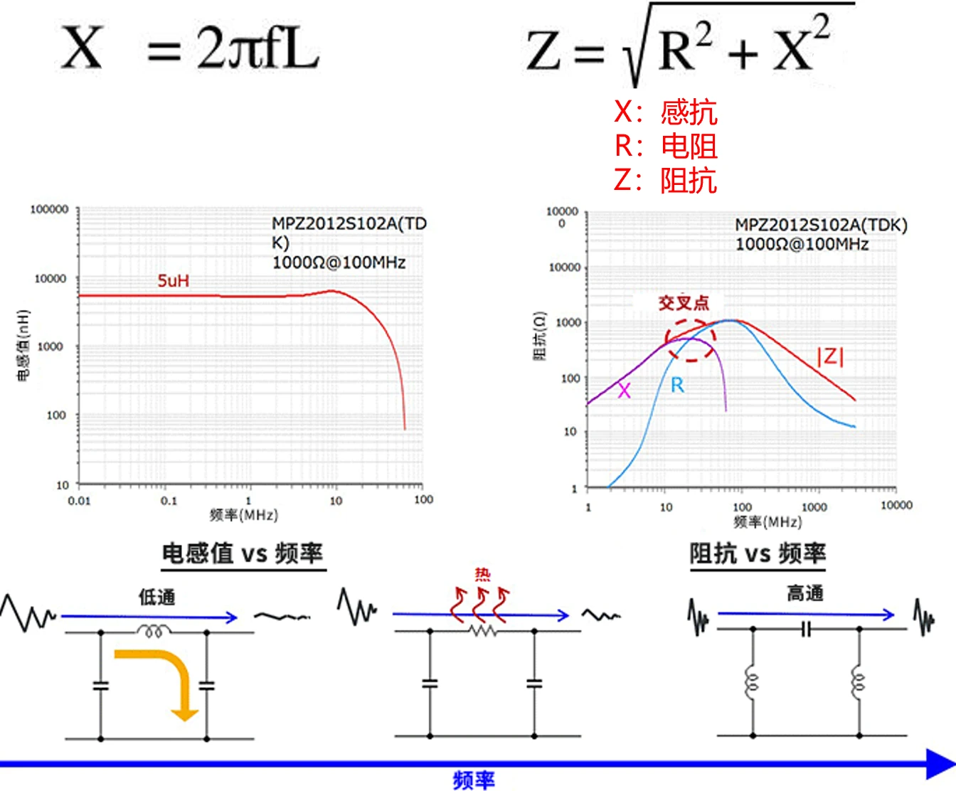 - 随着频率的升高,电阻增大,并且存在一个交叉点,当超过交叉点后,电阻将起到主导作用,将噪声转换为热能,这属于物理超度,从肉体上进行清除(相比之下,电感就不是物理超度,它不耗能)。