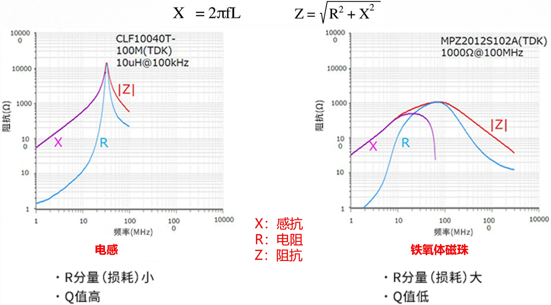 磁珠与电感不同,如下图,电感的主要特性是储能,阻抗随频率升高而升高(XL=2πfL),Q值好,常用于LC滤波、谐振等。