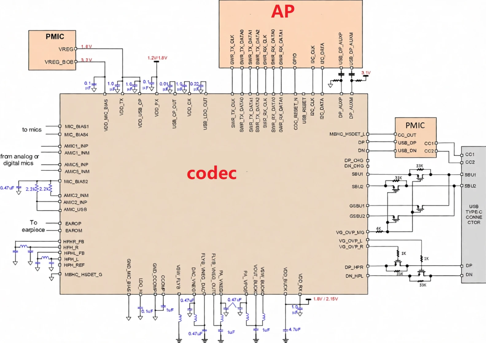 以高通某款老旧的codec芯片(属于平台套片)为例,我们可以由其管脚名称,连接关系,略知其功能。