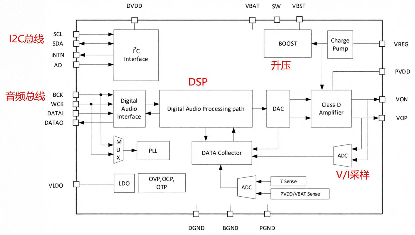 - 音频总线:I2S或TDM总线,用于接收来自codec的数字音频信号。