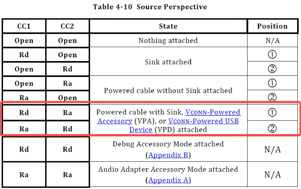 如果你测试过苹果Type-C口数字耳机,你会发现一个CC对地阻抗是5.1K,另一个CC对地阻抗是1K。熟悉Type-C规范的同学都知道,这5.1K其实就是Rd,1K就是Ra。根据Type-C规范提供的设备类型表,这是一个VPD设备,如下图所示: