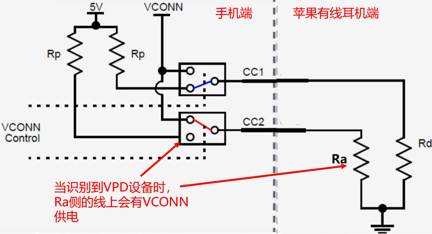 VPD设备,vconn powered usb device,顾名思义,那就需要手机端的一个CC(接入Ra的一边,即下图中的CC2)被配置成VCONN,作为电源给给耳机供电。
