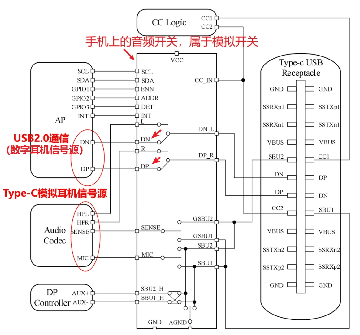 手机通过CC logic检测到数字耳机,这个UFP的接入后,会把自己的角色切换为DFP,并提供OTG 5V电源给耳机供电。并且手机上面的音频开关芯片,会将传输通道切换为AP端的DP、DN,为USB信号的传输做准备。