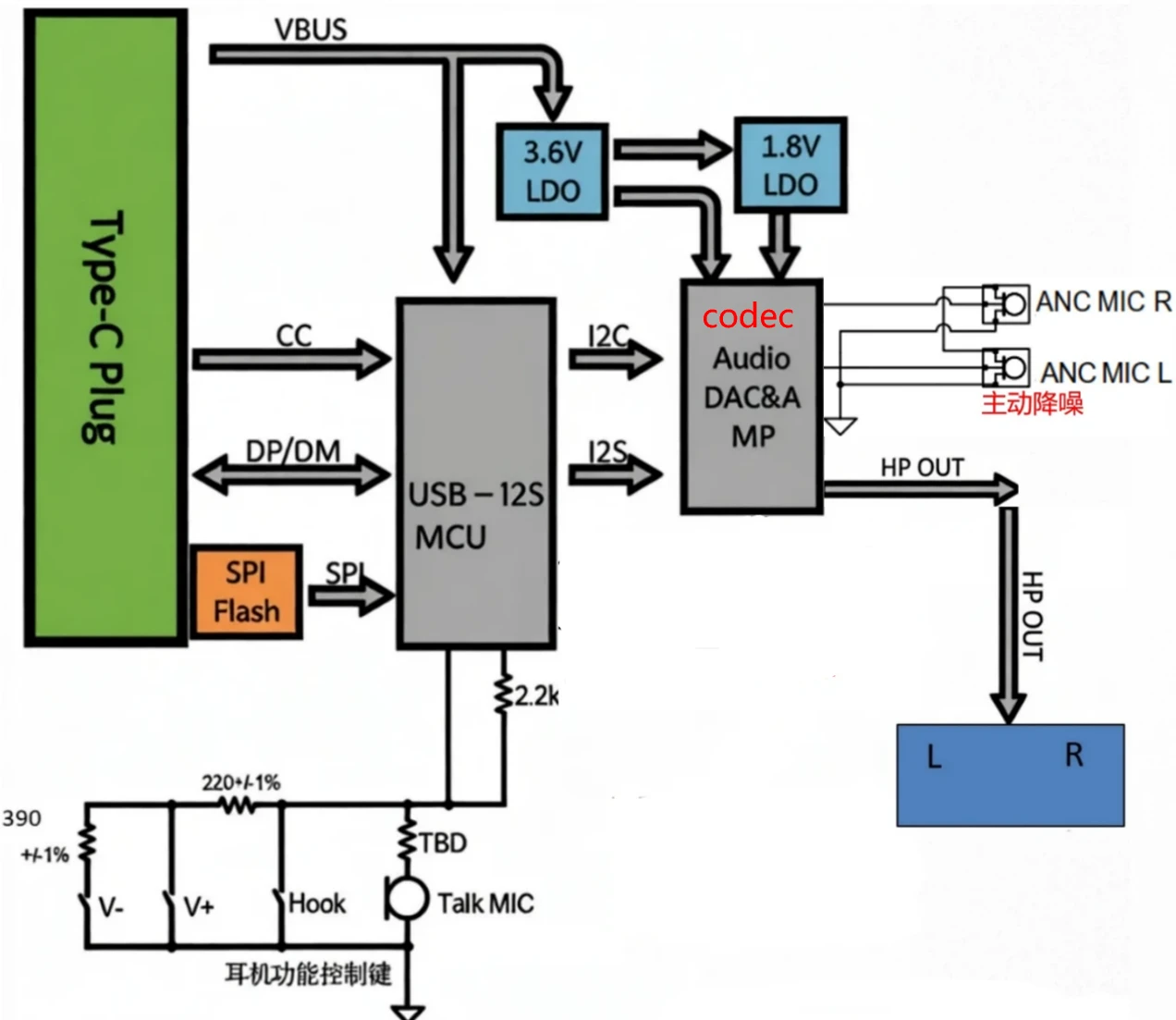 - 主动降噪:产生与外界噪音相等的反向声波,将噪音中和,如下图,通过ANC MIC R/L检测环境中的噪音,然后进行运算产生与噪音相位相反、振幅相同的声波,再进行叠加,最终左右声道输出的为叠加后抵消了噪声的声音信号。