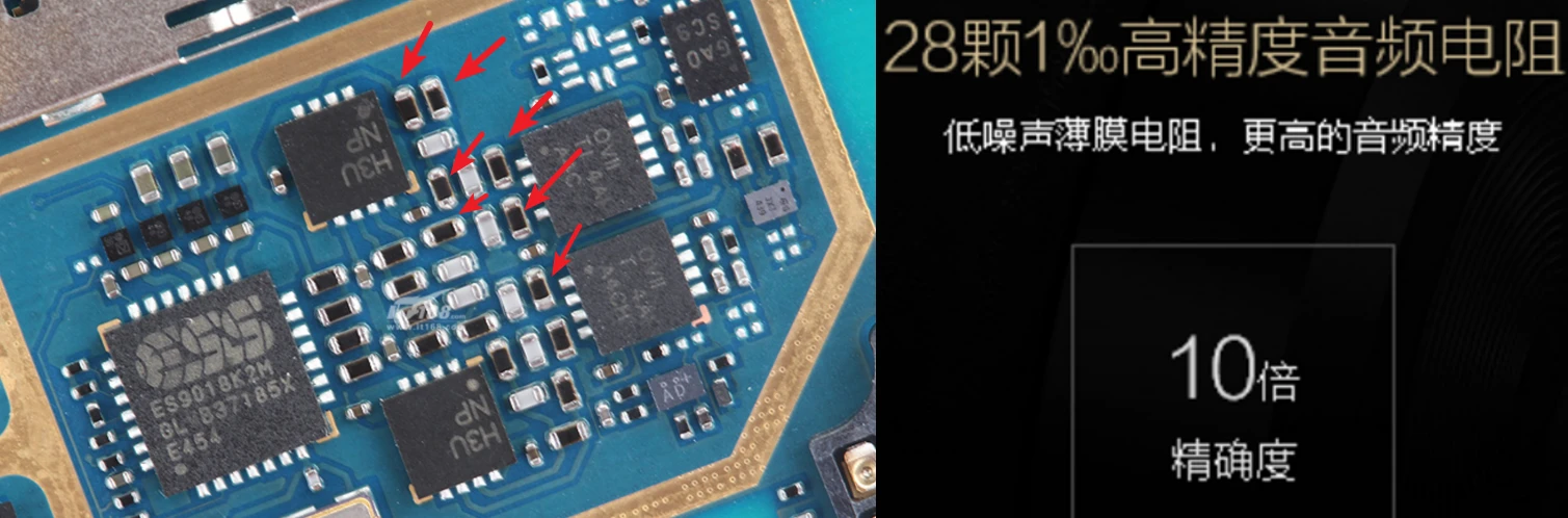 除了供电,有些Hi-Fi手机也会使用高精度电阻等,用来最大程度降低底噪,提升声音细腻度。如下图为小米Note的拆解图,使用了28颗1‰精度薄膜电阻来做配套。