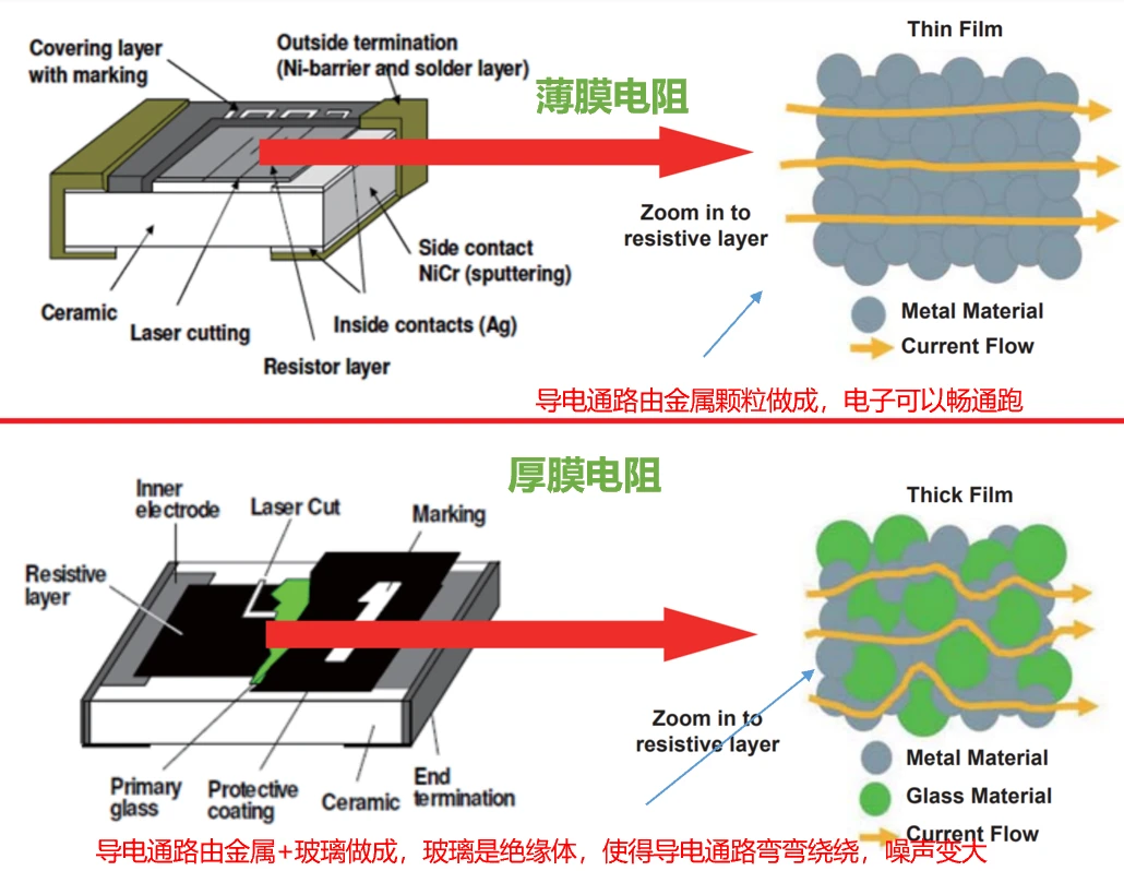 上面这些密密麻麻的、像小蚂蚁一样的东西就是薄膜电阻了。相比厚膜电阻(厚膜电阻在手机中更为通用),薄膜电阻精度高,稳定性好,噪声小,TCR小,适合用在高精度的场合。