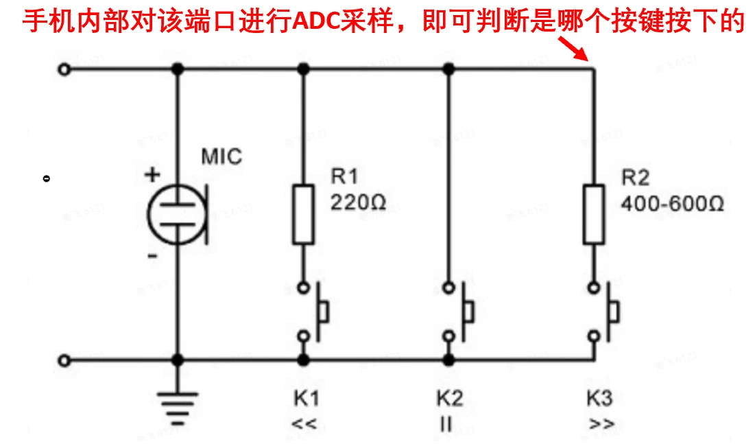 耳机线控按键本质上是一个电阻+开关,当按下不同的按钮时,会改变麦克风对地之间的电阻值。手机内部的芯片通过ADC检测阻值的变化,从而判断用户按下了哪个按钮。