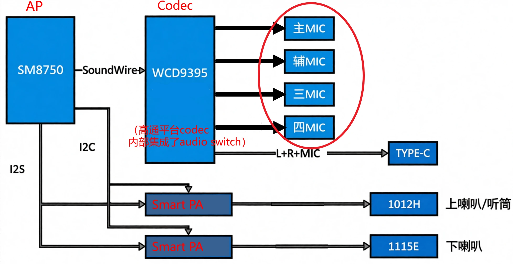 AP,应用处理器,在音频系统中属于大脑的角色。内部集成了各种数字信号处理功能,可以运行各种软件算法,包括多麦克风降噪、定向等复杂算法。此外,既然是大脑,就不得不说统领作用。它通过通信接口(比如I2S、sound wire等)控制codec、Smart PA等外围小弟。