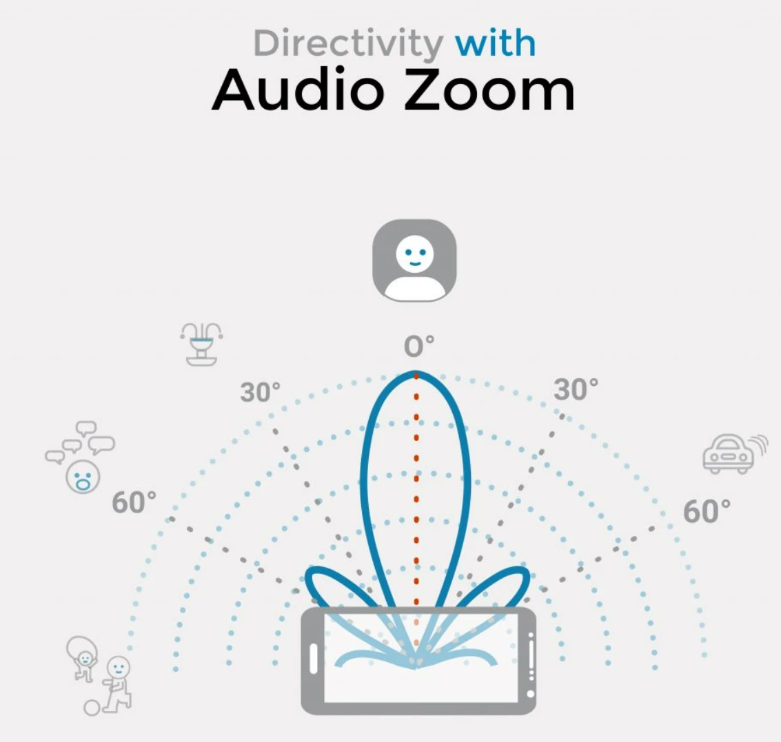 音频变焦,AUDIO ZOOM,在视频录制时,麦克风和摄像头协同工作。当你放大画面,欲拍摄更远的场景时,拾音范围也更聚焦于远处的拍摄对象,降低其他方向所传入的声音,使拍出来的视频更具有沉浸性。