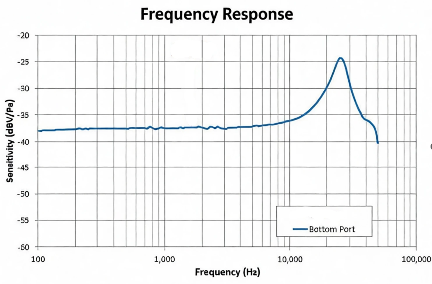 麦克风灵敏度随频率变化的曲线称为频率响应,表征了麦克风对不同频率声音的响应能力,如下图,为某底部开孔麦克风的频响曲线。