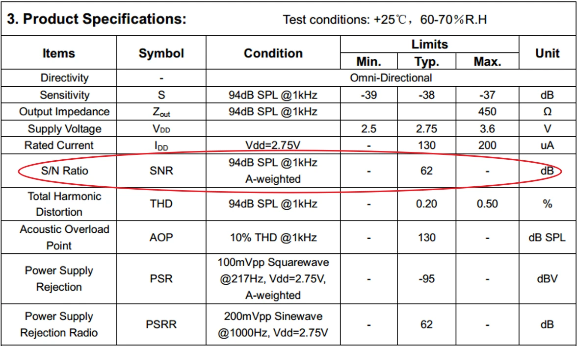 在模拟麦克风中,信噪比定义为94dB SPL(1Pa)的1kHz的声音下,麦克风所输出信号电平与其本底噪声电平的比值称为信噪比,单位为dB,公式如下: