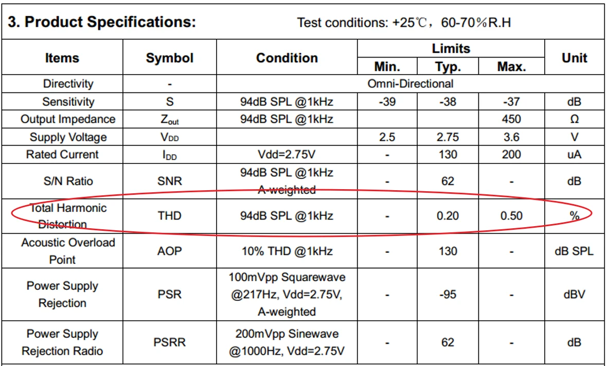 THD,总谐波失真,表征麦克风在94 dB SPL 1KHz声音下,输出信号中产生的谐波失真的程度,即失真产生的总谐波的有效值与总输出的有效值之比,通常用百分比表示。