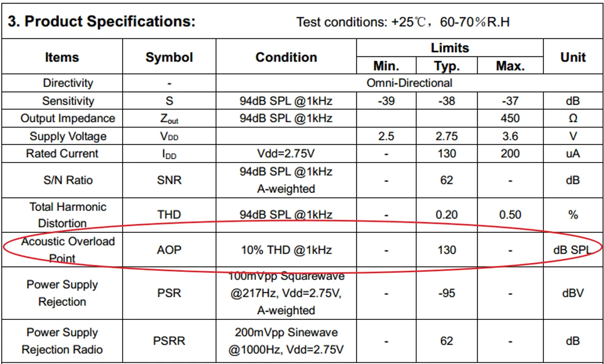 通常将麦克风输出信号失真程度为10%的点定义为声学过载点,当前手机麦克风AOP一般在122~135dB SPL。