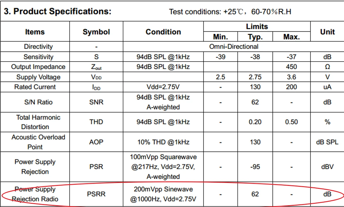 电源抑制比,Power Supply Rejection Ratio,简称PSRR,是衡量麦克风对抗电源污染(纹波和噪声)的能力,单位为dB。高PSRR的麦克风有利于抑制和化解手机内复杂的电源噪声。