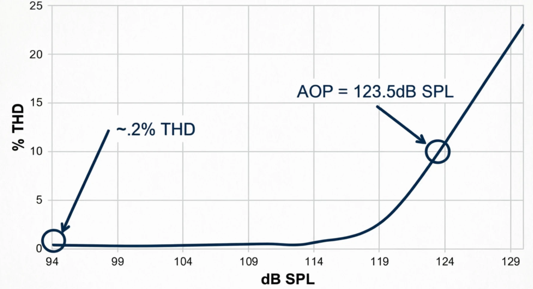 对麦克风来说,在面对大声压的声音时同样有这种状况,虽不至于聋,但转换为电信号时会THD失真。如下图,当声压级小于声学过载点时,失真通常不会随着声压级升高而大幅增加;但是当达到过载点时,失真开始快速升高,声音变得鬼畜,不堪听。